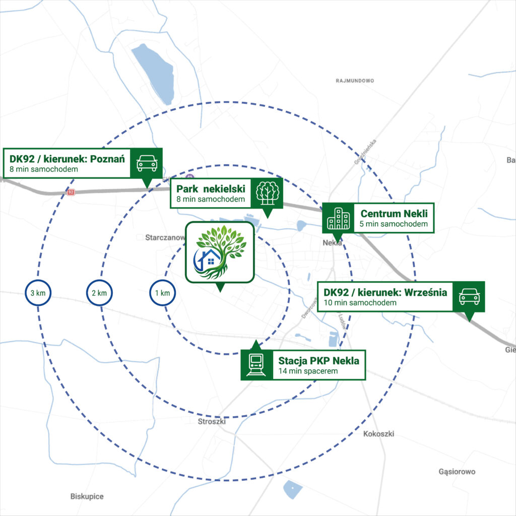 Zielone Starczanowo to spokojne miejsce do życia z wygodnym dojazdem do Poznania. Do miasta szybko dotrzesz zarówno samochodem – dzięki bliskości trasy nr 92 – jak i pociągiem ze stacji PKP Nekla, co daje Ci komfortowy wybór na co dzień. Dzięki dobrej komunikacji oszczędzasz czas w drodze do pracy oraz podczas codziennych spraw.