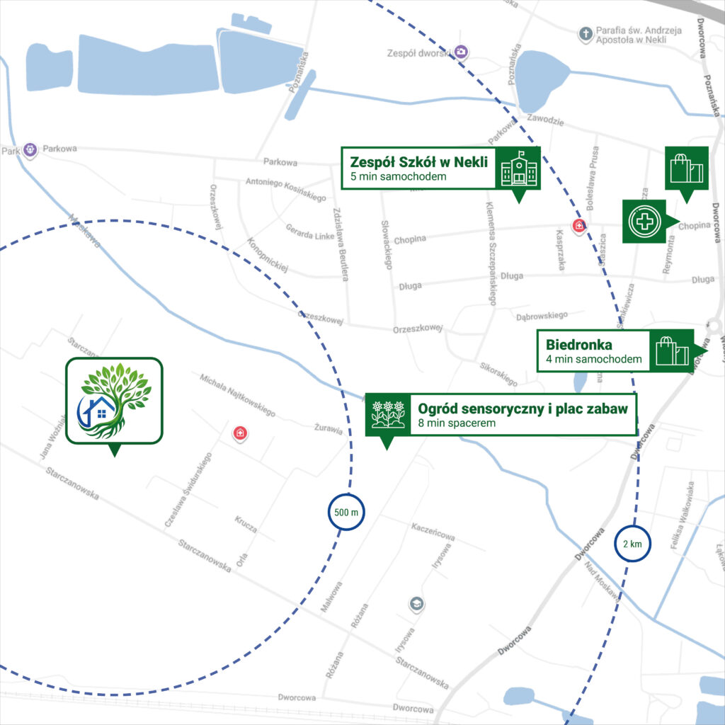 Do centrum Nekli 2 km – masz pod ręką sklepy, szkoły, usługi i wszystko, co potrzebne do wygodnego życia.